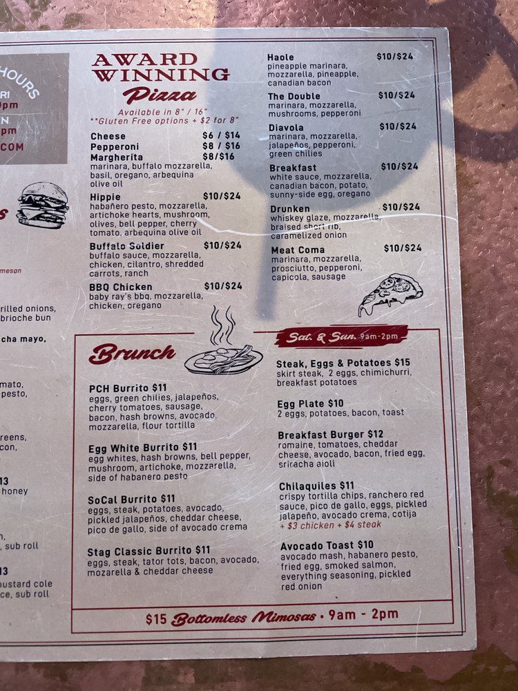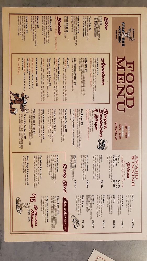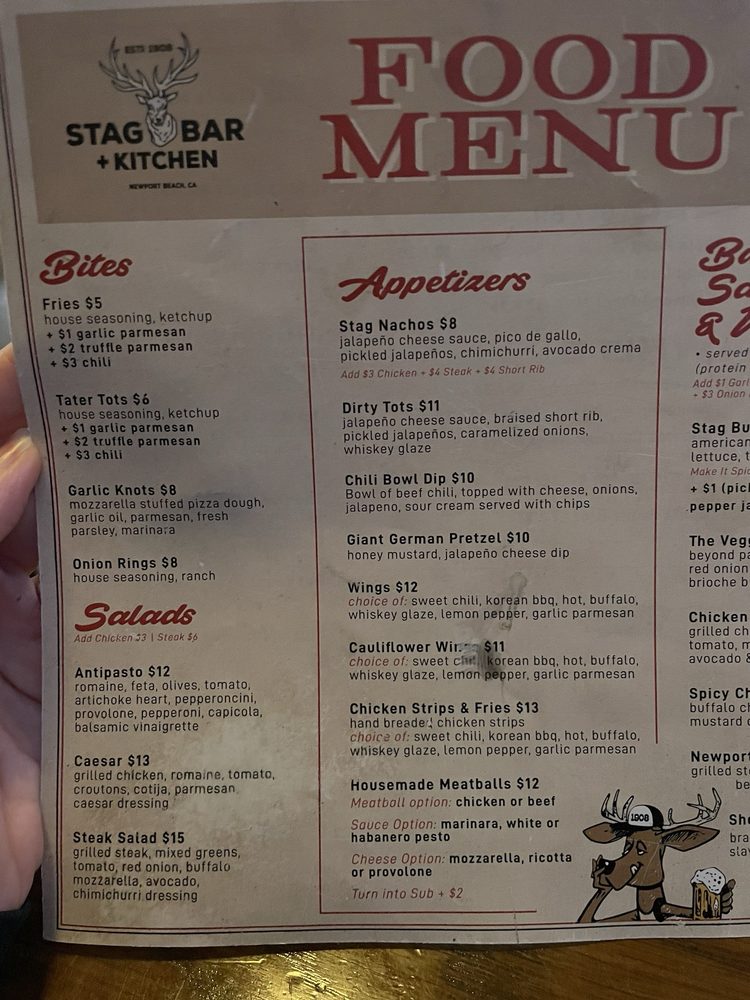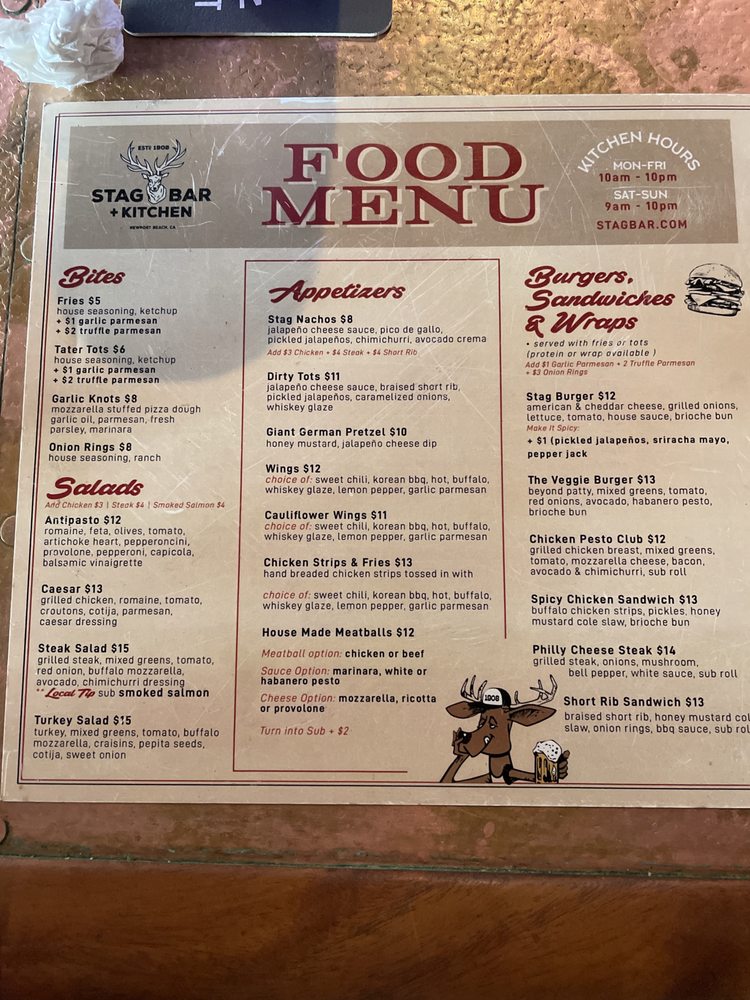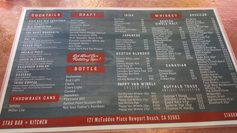 Stag Bar Kitchen in Newport Beach, CA offers a vibrant atmosphere and an extensive menu that caters to a variety of preferences. Located at 121 Mc Fadden Pl, this establishment is known for its delicious pizza, American cuisine, and a well-stocked bar. With options for vegans, vegetarians, and a range of dietary needs, Stag Bar Kitchen prides itself on being inclusive. The restaurant also offers delivery, takeout, and catering services, making it a versatile choice for any occasion. Customers rave about the friendly staff, energetic ambiance, and top-notch service. With amenities like outdoor seating, pool tables, and a jukebox, Stag Bar Kitchen provides a lively setting for social gatherings or casual hangouts. Whether you're looking to enjoy a meal with friends, grab a drink, or host a special event, Stag Bar Kitchen is a must-visit destination.
